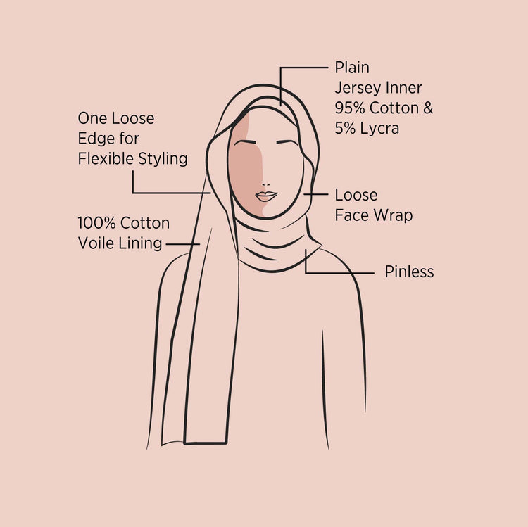 This instant hijab style is a pinless “wrapped” hijab that will let you achieve the loose hijab look without the extra layers. It features a loose wrap all around the forehead , and a hidden elastic under chin to fit all head sizes.