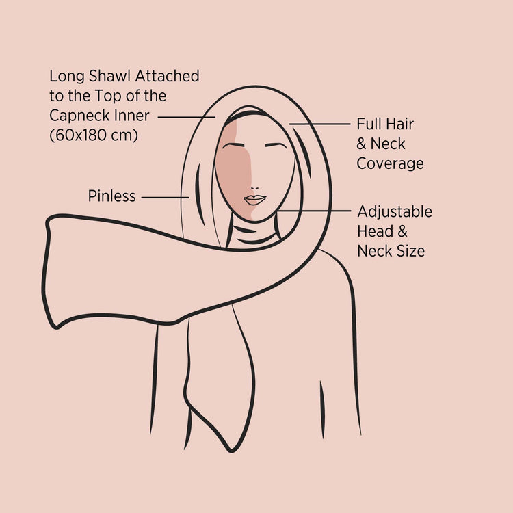 This instant hijab style will let you achieve a loose hijab or a modest turban look in no time. It features two long shawl ends 60x180cm (24x71in) attached to a full coverage inner that covers the hair and neck.